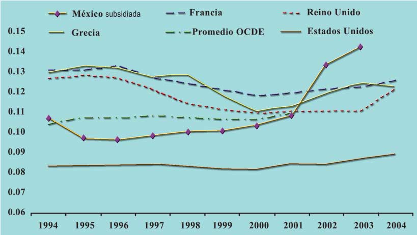 La Organización para la Cooperación y el Desarrollo Económicos (OCDE) fue una de las primeras instituciones económicas especializadas que realizó un estudio comparativo sobre los precios de la electricidad mexicana en su revisión de nuestra economía de 1999/2000, donde llamó la atención sobre el elevado nivel de las tarifas y los subsidios eléctricos.(1) Los precios subsidiados del servicio eléctrico residencial mexicano se han colocado debajo del promedio de los países de la OCDE para varios de los años de la última década (entre 1995 y 2000, véase Gráfica 1). Sin embargo, una vez que se incorpora el monto del subsidio, el costo del servicio eléctrico residencial mexicano se vuelve significativamente superior al de los países de la OCDE. Ejemplificando: en el año 2000 el precio medio de la electricidad residencial subsidiada en México (0.105 dólares por kWh) era casi igual al del promedio de los países miembros de la OCDE (0.104 dólares), es decir, el precio medio mexicano era competitivo en términos internacionales. Pero ese mismo año el subsidio residencial mexicano equivalía a entre 59% y 76% del costo del servicio (dependiendo de si se trata de las taifas de la Comisión Federal de Electricidad, CFE, o de Luz y Fuerza del Centro). Una vez considerado el subsidio, el costo del servicio eléctrico residencial mexicano se encontraba significativamente por arriba del promedio de la OCDE. De hecho, el impacto de la reducción de subsidios eléctricos decretada por el gobierno mexicano a partir de 2002 puede verse claramente en la serie de datos de la Agencia Internacional de Energía, pues ubicó el precio de la electricidad residencial mexicana –incluso con los considerables subsidios todavía incluidos– claramente por encima del promedio de países de la OCDE.