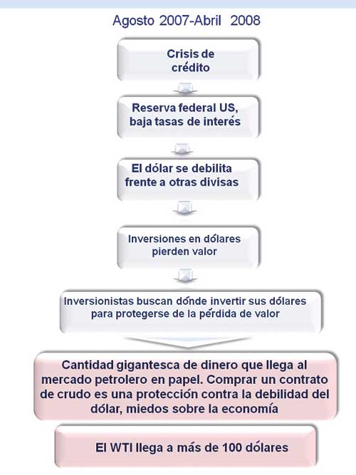 Si usted tiene cien dólares y sabe que ese dinero ya no va a comprar los mismos euros o acciones dentro de una semana, ¿qué hace? Los cambia y compra euros, o compra mas acciones de su empresa favorita, ¿no? Con la amenaza de recesión financiera, muchos administradores de inversiones –personas que deciden dónde poner millones de dólares– no quieren comprar acciones. Muchos tampoco quieren comprar euros u otras monedas, porque si los bancos centrales de esas regiones deciden bajar las tasas de interés, sale lo mismo. Entonces, la solución es comprar contratos de crudo, de acero, cobre, oro u otros commodities.