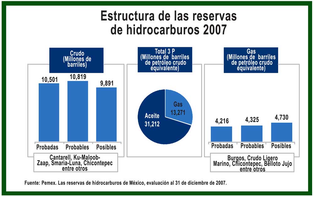 La magnitud de los recursos de hidrocarburos con que aún cuenta el país son claramente ilustrados por las características del Paleocanal de Chicontepec y las aguas profundas del Golfo de México: el primero, también llamado “Proyecto Aceite Terciario del Golfo”, localizado en la región norte de los estados de Veracruz y Puebla, contiene sólo el 7 % de las reservas probadas, pero el 42 % (18.8 mil millones de bpce) de las reservas totales del país. Se estima que su producción diaria, actualmente en un poco más de 30 mil barriles, podría ascender a 500 mil en diez años(5). El área de aguas profundas, como recurso prospectivo, y sin confirmar, Pemex lo ha cifrado en 29.5 mil millones de barriles.