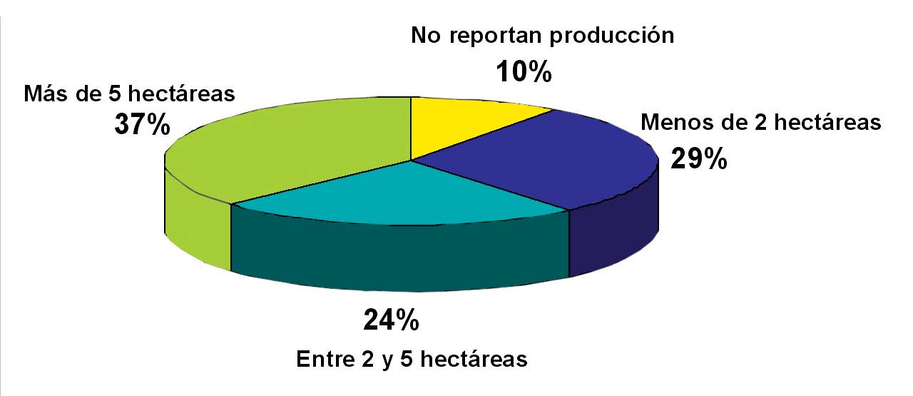 Se presentan una tabla y gráfica que muestra que de los 3´400,000 productores agrícolas de México, el 80% (2´736,000) se dedican al cultivo de granos y oleaginosas; siendo estos cultivos los menos rentables, caracterizados también por el uso extensivo de mano de obra.