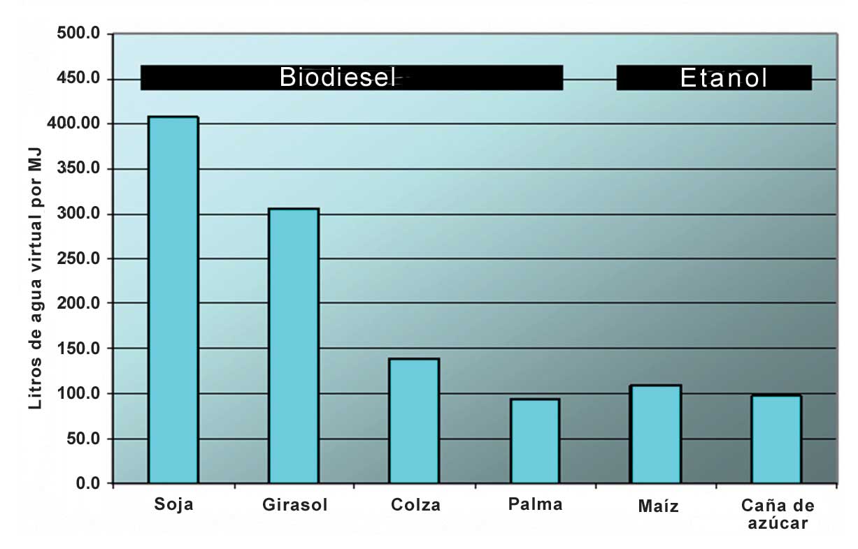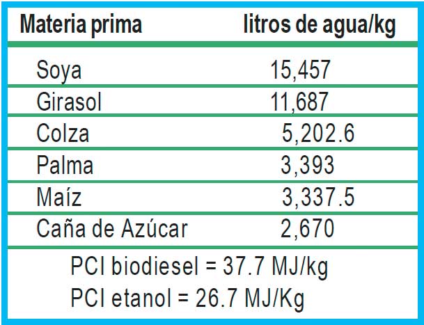 La producción de un kilogramo de materia prima para la producción de biodiesel o etanol necesita volúmenes cuantiosos de agua, lo que significa que si se pretendiera producir cualesquiera de estos tipos de cultivos se tendría que proporcionar abundante agua para obtener una adecuada productividad del suelo y que se puedan reducir los costos, a fin de que éstos sean competitivos con los del diesel del petróleo o la gasolina.