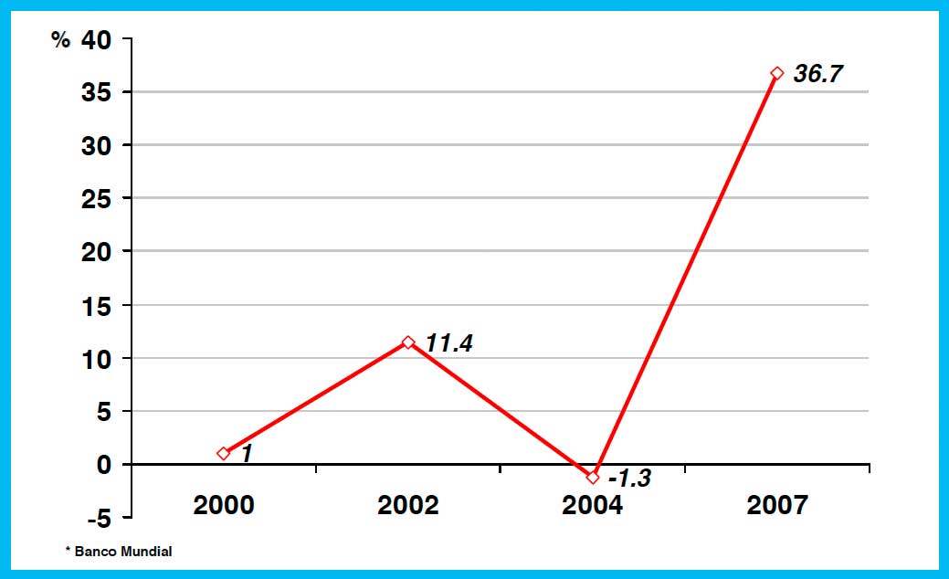 alimentos, existen factores externos que influencian la fijación de sus precios al consumidor (inflación importada) que es el origen principal de la elevación de precios en América Latina, observándose en la gráfica que se presenta a continuación, que a partir del año 2004 en México se tuvo una inusual elevación, cuyo encarecimiento se asocia a los siguientes factores: