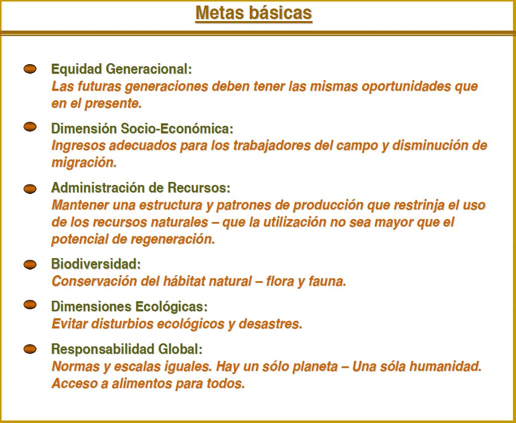 Es también menester tomar en cuenta las siguientes metas básicas para lograr una agricultura sustentable: