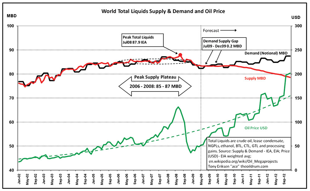 ¿Cuándo se dará ese cénit de la producción del petróleo crudo mundial? A juicio de muchos expertos, ya llegó. Tony Eriksen publicó con el titulo de ¨Producción mundial de petróleo¨ (World Oil Production – Update May 2009) que el cénit se alcanzó en julio del 2008 al obtener 74.82 millones de barriles por día (mbd) de crudo, con una declinación esperada del 3.4% en su oferta para los periodos del 2010 – 2012, además de estimaciones relacionadas con su precio para periodos similares (2) (Figs. a y b). También la ASPO (Association for the Study of Peak Oil and Gas) publicó en el boletín num. 100 de abril 2009, que el cénit del petróleo convencional fue en el 2005 y del no convencional y por ende el mundial en el 2008 (3). Al igual, Matthew R. Simmons en diferentes presentaciones como las de abril 21, 27 y 6 de mayo del presente año, ha reiterado que el ¨peak-oil¨ convencional fue en el 2005 (4) y Jean Laherrere, en su presentación del 20 de octubre del 2008 en la 7ta Conferencia Anual de la ASPO, en Barcelona, España, estableció criterios similares del ¨peak-oil¨ mundial (5).