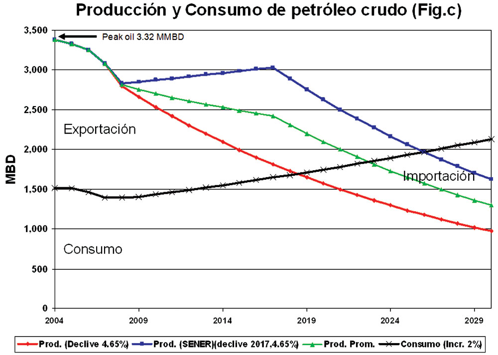 México rebasó su cénit en el 2004(6), es decir, se considera imposible alcanzar de nuevo el nivel máximo de producción registrado entonces (3.38 mbd) y que los potenciales descubrimientos y desarrollos, por más significativos que pudiesen ser y el tiempo requerido de entre 4 y 8 años para desarrollar su explotación y alcanzar mayores niveles de eficiencia, seguramente no modificarían el ¨peak¨ antes mencionado, si bien estos desarrollos pudiesen atenuar y/o mantener la tasa de declinación en la producción. Pemex, en el 2004 y el 2009 (abril), registró una producción de petróleo crudo de 3.38 mbd y 2.66 mbd, respectivamente, volúmenes que equivalen a una tasa de declinación anual en la producción del 4.69% (6), la cual, de mantenerse, implicaría que no se dispondrán de excedentes de exportación a partir del 2019, si se considerara una tasa de crecimiento general en el consumo interno del 2.0% anual (Fig. c). Además, podemos observar con base en datos proporcionados por la ¨Prospectivas del petróleo 2008-2017¨ (7) y asumiendo una declinación anual de la producción del 4.67% a partir del 2026, que después del 2025 México requeriría competir por la importación del petróleo menguante en el mercado internacional, mientras que para un caso intermedio (promedio de ambos) estaría en similar situación a partir del 2023.