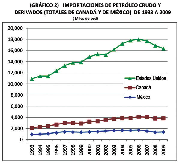 (2) Es importante señalar que el máximo histórico se registró en 2006 con 18 millones de barriles diarios. VerImportaciones de crudo y derivados totales de 1993 a 2009. http://tonto.eia.doe.gov/dnav/petpet_moveimpcus_a2_nus_ep00_im0_mbbl_m.html (fecha de consulta 5 de mayo de 2009)