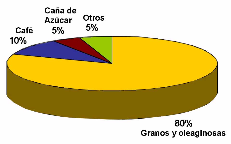 Se presentan una tabla y gráfica que muestra que de los 3´400,000 productores agrícolas de México, el 80% (2´736,000) se dedican al cultivo de granos y oleaginosas; siendo estos cultivos los menos rentables, caracterizados también por el uso extensivo de mano de obra.