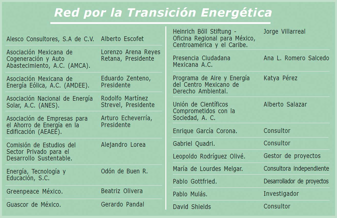 La Red por la Transición Energética es un grupo muy diverso de organizaciones e individuos preocupados por la situación actual y los efectos económicos y ambientales de la producción, transformación e uso final de la energía en México, pero también activas, individual y colectivamente, por la promoción y búsqueda de alternativas.